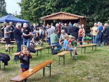 13:00 Uhr. Den Bikern noch eine Bratwurst (oder mehrere) in die Hand geben, damit sie auch heile zu Hause ankommen. (Ich wusste gar nicht, dass 40 Minuten Motorradfahren so hungrig machen). Dabei noch letzte Gespräche geführt.