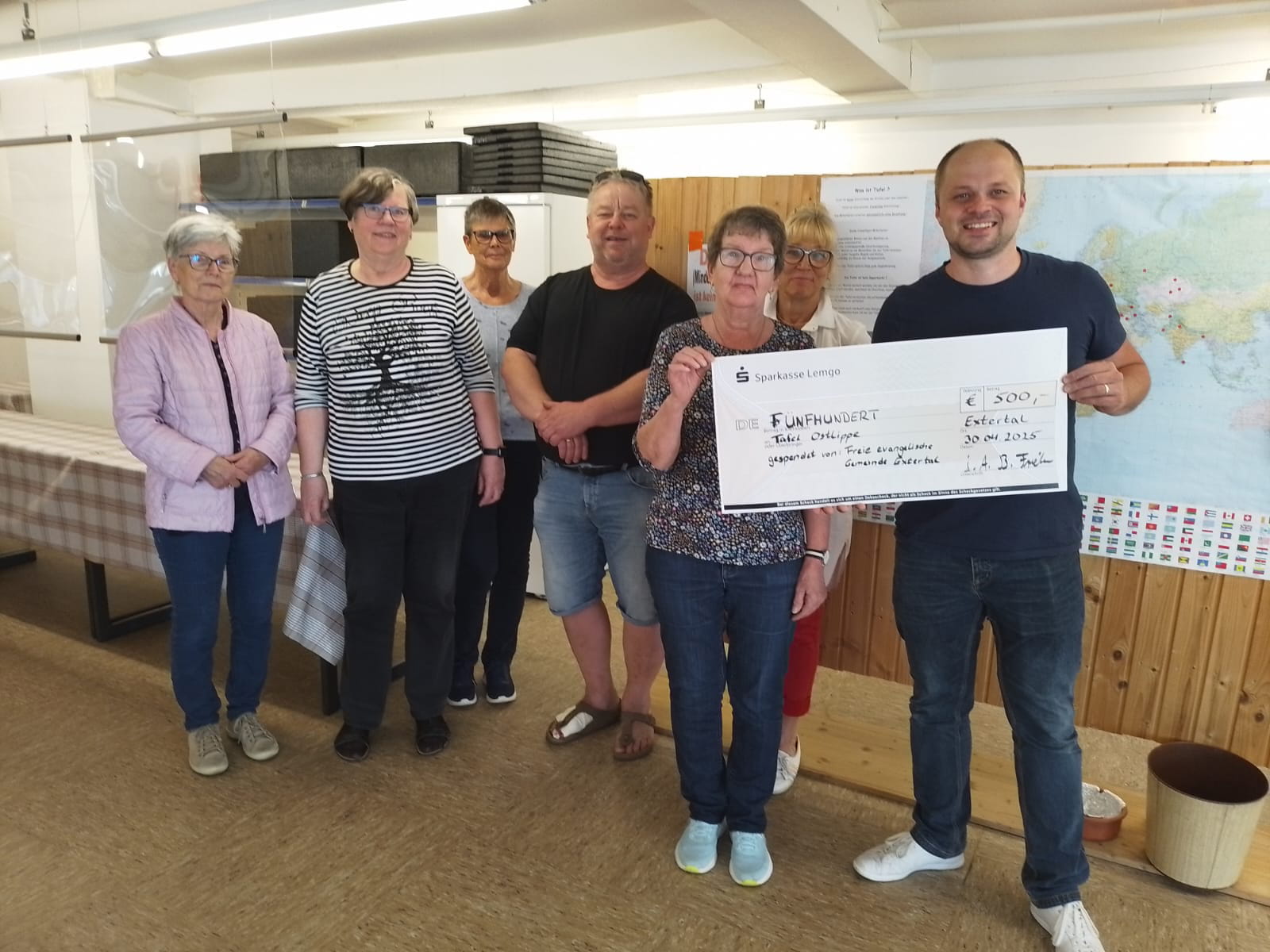 Wir wollten es nicht für unsere Männerarbeit selbst behalten, sondern dieses Geld an eine ortsansässige Institution spenden, um dem Ort zu zeigen, dass uns die Menschen im Extertal wichtig sind und uns das Vereinsleben des Ortes am Herzen liegt. Hierbei sind wir dann auf die Tafel Ostlippe gekommen. 24 ehrenamtliche Helfer unter der Leitung von Frau Uhlenbrock sorgen jeden Mittwochnachmittag in der Mittelstraße dafür, dass bedürftige Menschen mit Kleidung und Essen unterstützt werden.